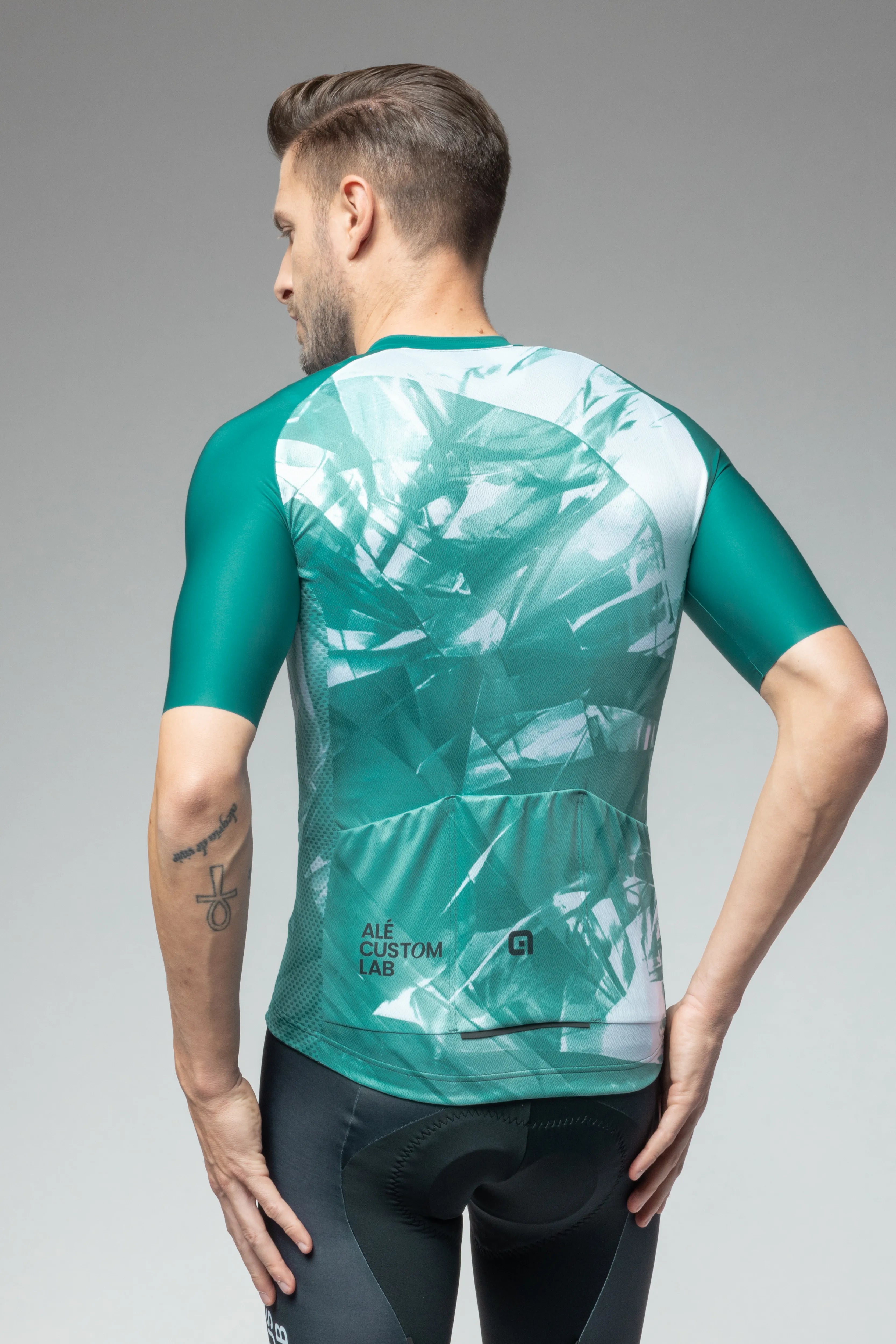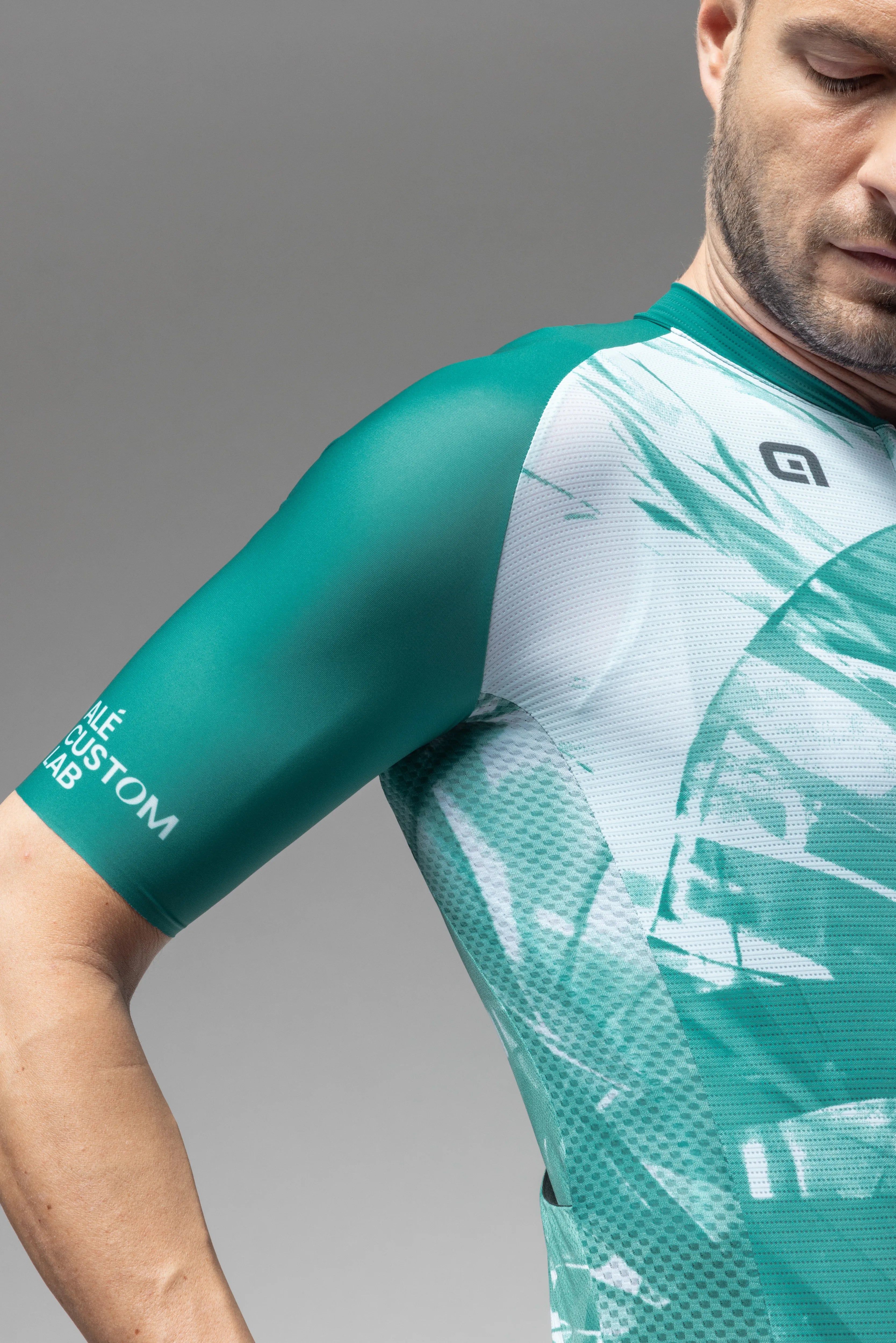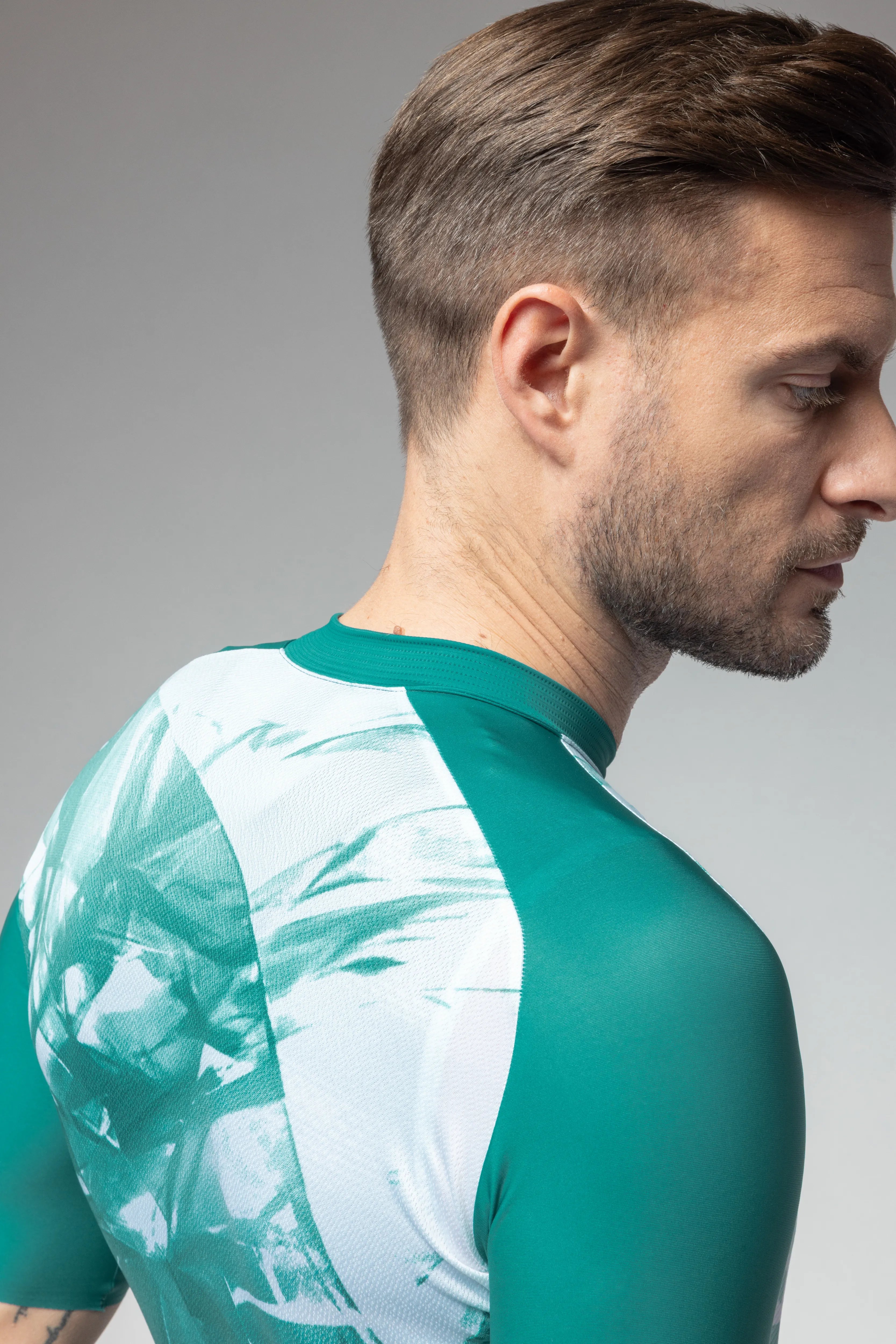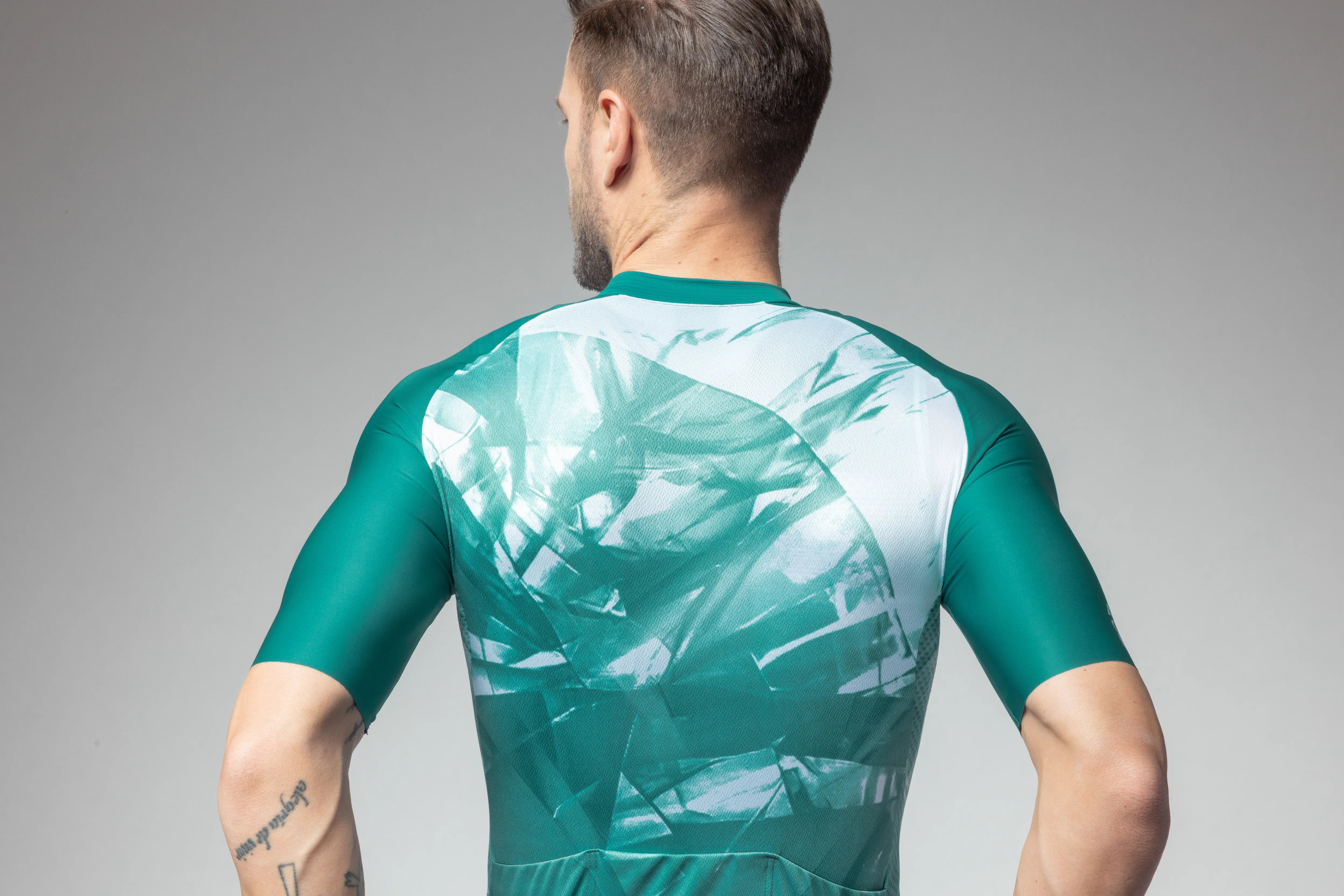 フロントは通気性に優れたメッシュ素材、袖は伸縮性のあるカットオフ仕上げ、背面にはダブルフェイス構造の生地を採用。
